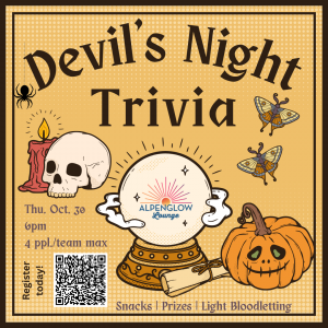 Alpenglow Lounge 54225 N Circle Dr, IdyllwildJoin us for a night of wicked trivia. Knowledge will be arbitrary, ghostly, and based on co-owner Mo’s likes and dislikes and…probably little else. Snacks! Team showdowns! Prizes! And, of course, wine, beer, and all the other delights of The Glow. Use the link to reserve your team’s spot! Use the link to reserve your […]